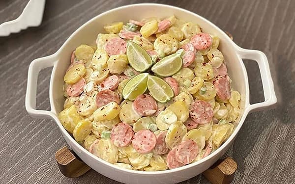 مواد لازم برای ۴ نفرسیب زمینی۲ عدد بزرگسوسیس آلمانی۲ عددپیازچه½ پیمانهسس مایونز۳ قاشق غذاخوریآب لیمو ترش۲ قاشق غذاخوریپاپریکا½ قاشق چایخورینمک و فلفل سیاهبه مقدار کافی دستور تهیه سالاد کارتوفل مرحله اول برای تهیه سالاد کارتوفل آلمانی ابتدا